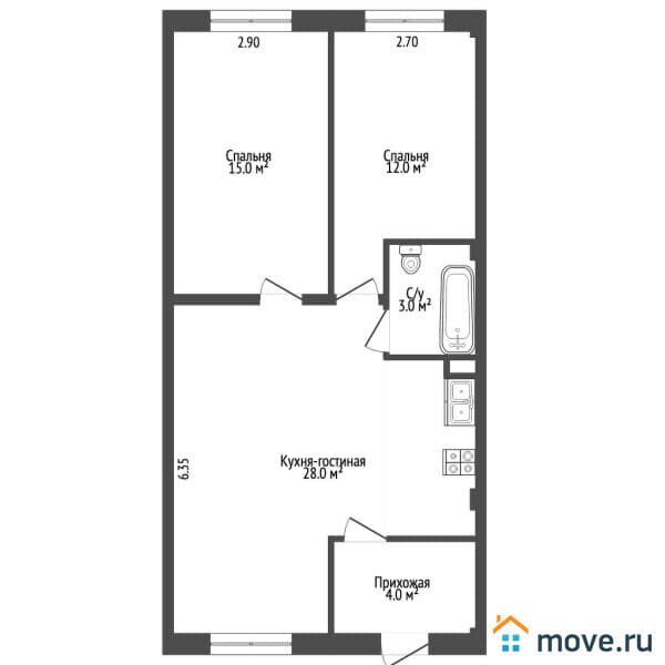 ?В квартире: кухня-гостиная с панорамными окнами – 28 кв. м, две смежные спальни – 12 кв. м и 15 кв. м, санузел совмещенный – 3 кв. м, прихожая – 4 кв. м.