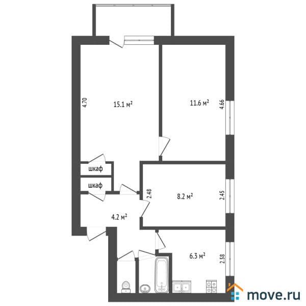 Три спальни, гостиная кухня, санузел совмещенный и балкон.