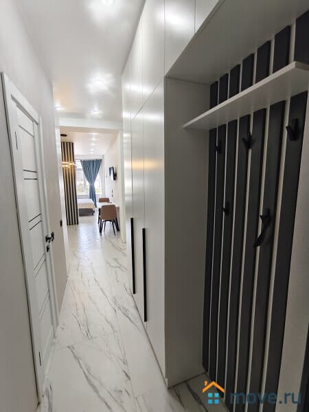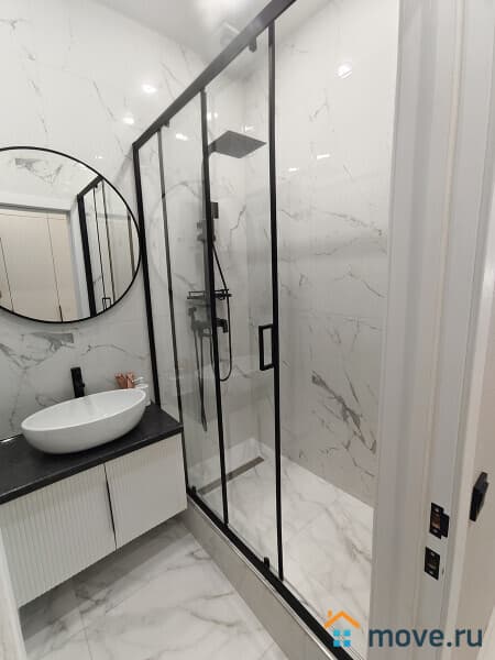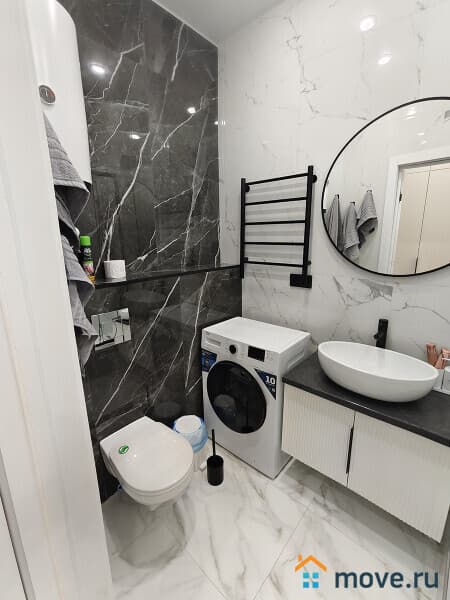 Панорамные арочные окна (южная сторона), тюль, шторы, инверторная сплит-система зима/лето, телевизор смарт, интернет, холодильник с морозильной камерой, микроволновая печь, чайник, индукционная плита, гладильная доска, утюг, сушилка для белья, посуда, столовые приборы, постельные принадлежности, вытяжка (санузел + кухонная зона), душевая кабина, фен для волос, бойлер, плитка керамогранит, инсталляция с подвесным унитазом, вместительная стиральная машина автомат на 6 кг., полотенца, полотенцесушитель, ванные принадлежности, проходные выключатели, полная освещённость.