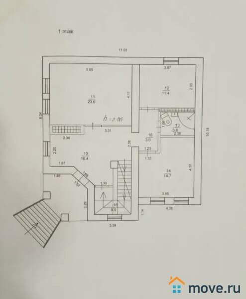 Общая площадь основного дома 251,2 м2, жилая площадь 99,5 м2: 2 жилые комнаты по 23,6 м, 2 комнаты по 11,7 м2, 2 комнаты по 14,7 м2, кухня-гостиная 23 м2, 2 с/у совмещённых по 3,8 м2, 2 холла по 16,4 м2, техническое помещение (котельная) 6,6 м2, помещение под сауну 10,3 м2, кладовая 5 м2, гараж 22,8 м2 м2.