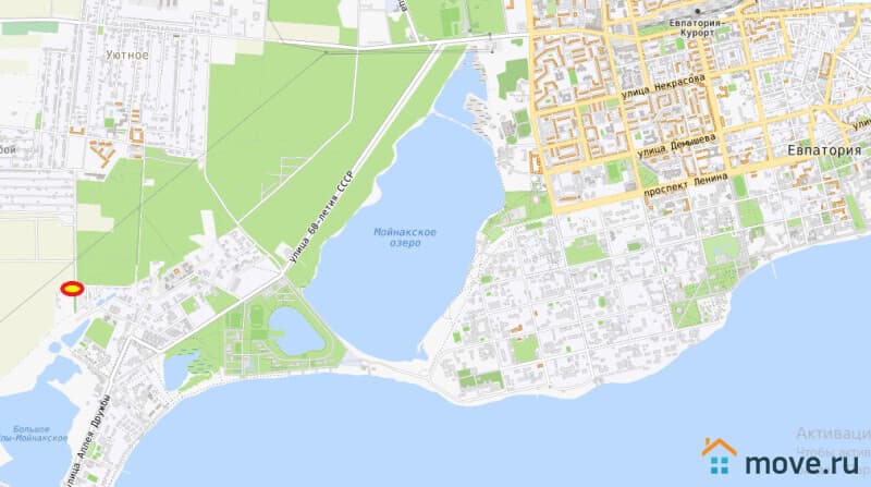 Расположен в пригороде, 6 км от Евпатории, и 1,3км от моря и самого лучших пляжей в Крыму (Аква, Лазурный берег), с развитой инфраструктурой (кафе, рестораны, столовые, игровые площадки и др.)