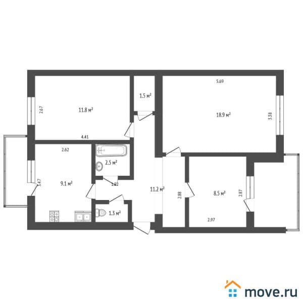 ?В квартире: три изолированные комнаты (спальня - 11,8 кв.м. и 8,5 кв.м., гостиная - 18,9 кв.м.), кухня - 9,1 кв.м., кладовая – 1,5 кв.м., санузел раздельный 2,5 кв.м. и 1,3 кв.м, большая лоджия, балкон.