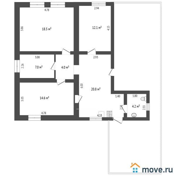 ?Дом состоит из: кухни, трёх спален, гостиной, санузла и прихожей.