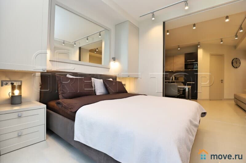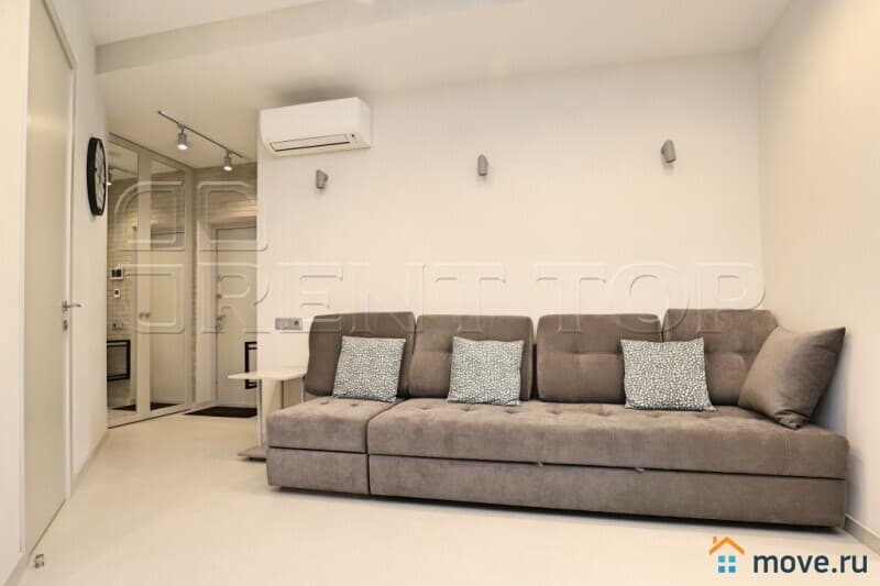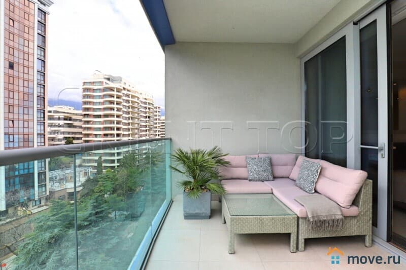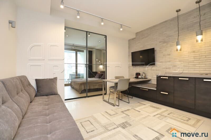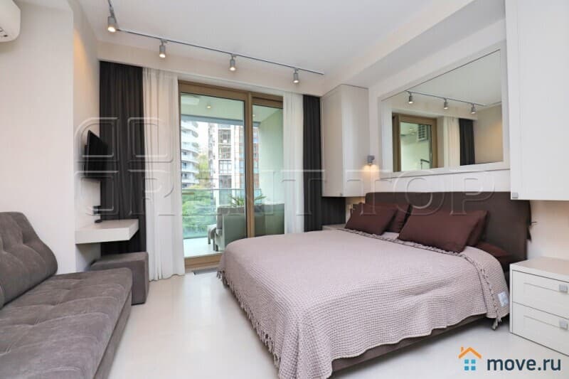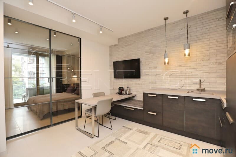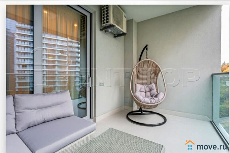 Современные апартаменты с отдельной спальней и просторной кухней-гостиной, раздвижные двери обеспечивают удобное зонирование пространства. Просторный балкон оборудован зоной отдыха с подвесным креслом-коконом и маркизой.