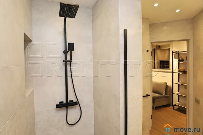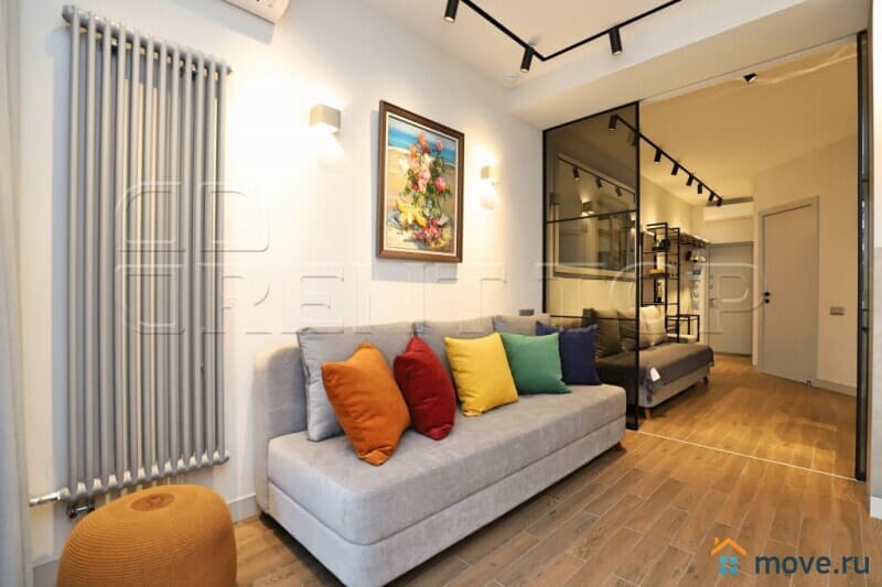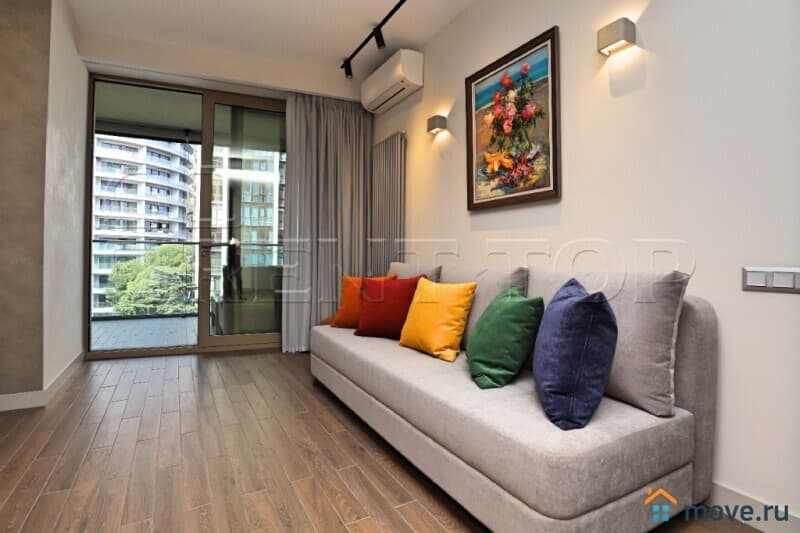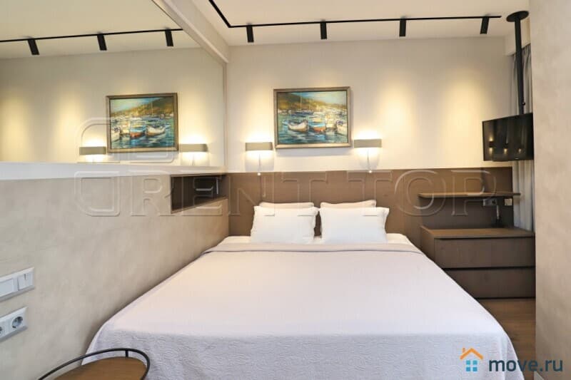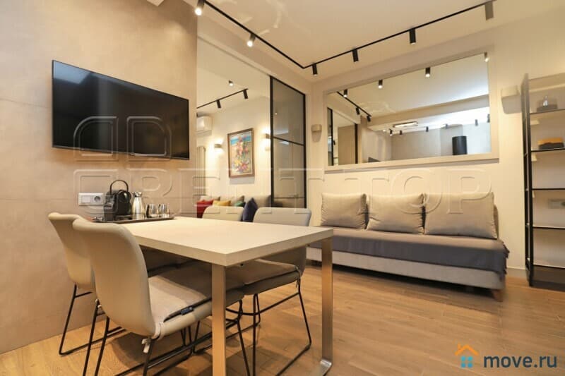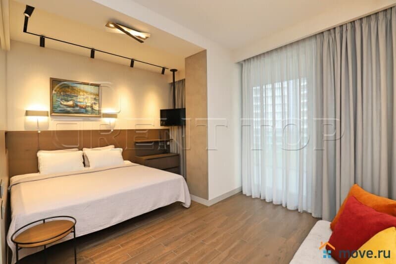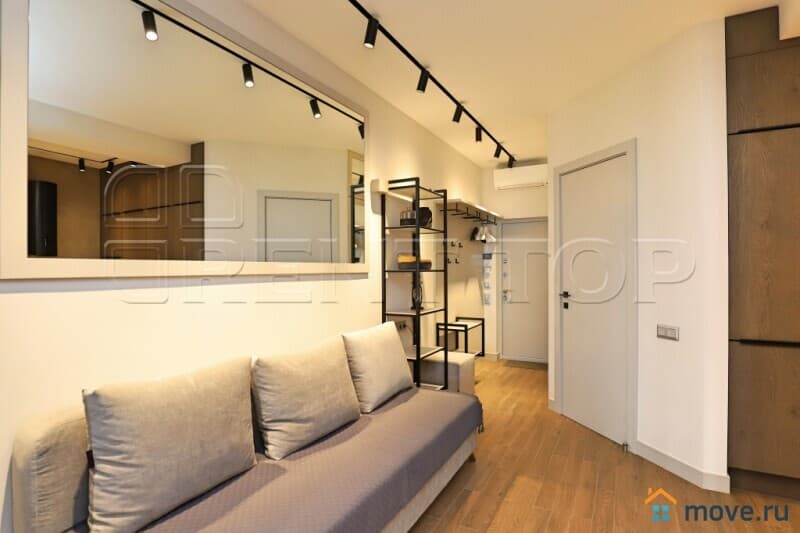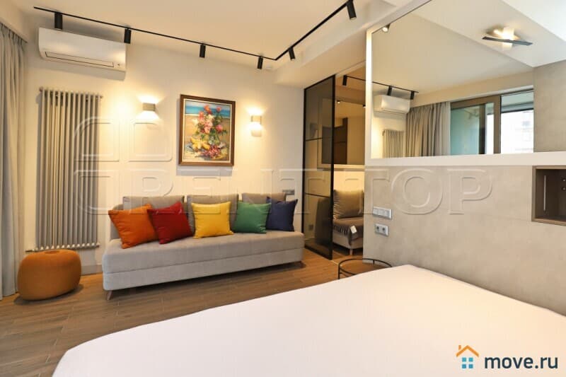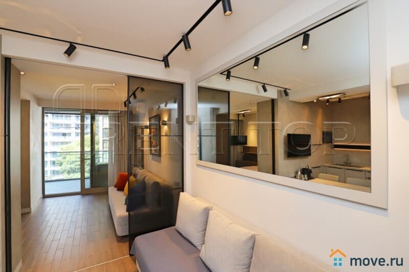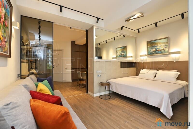 Современные апартаменты с отдельной спальней и просторной кухней-гостиной. Между комнатами установлены раздвижные двери, предусмотрены встроенные шкафы для хранения. Интерьер выполнен в светлой современной стилистике.