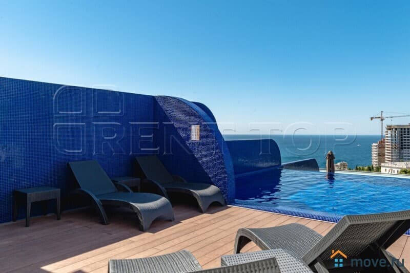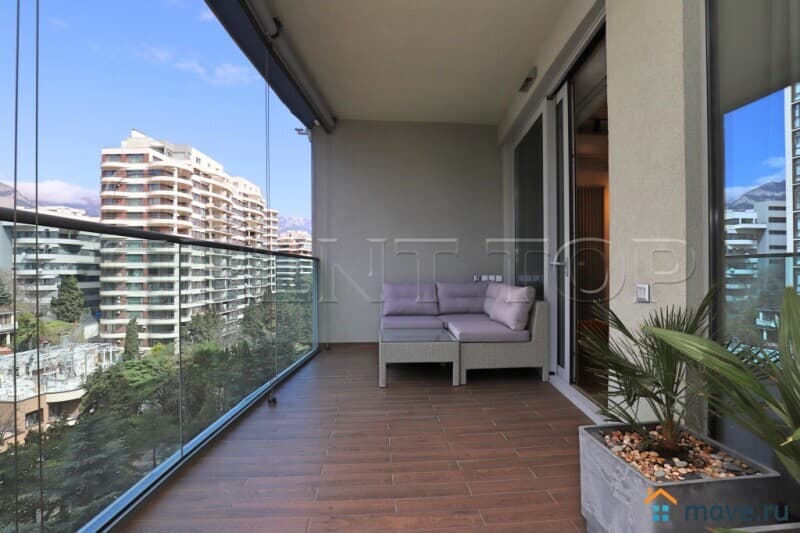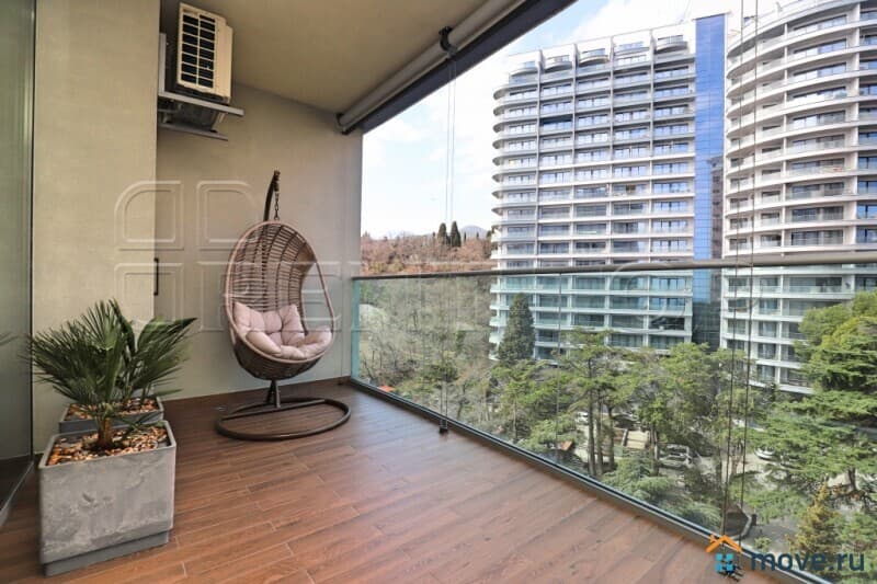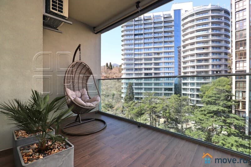 Просторный балкон оборудован уютной зоной отдыха с креслом-коконом и маркизой. Комфортное дополнительное пространство для отдыха у моря.