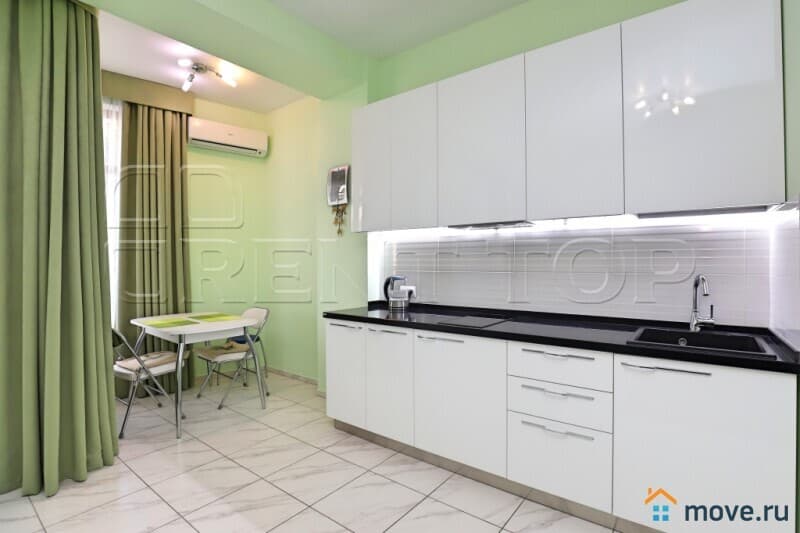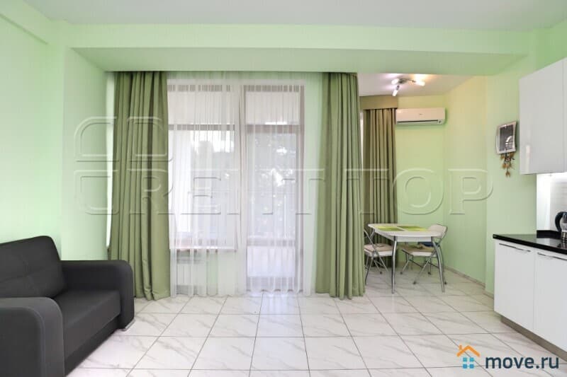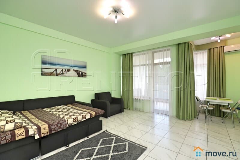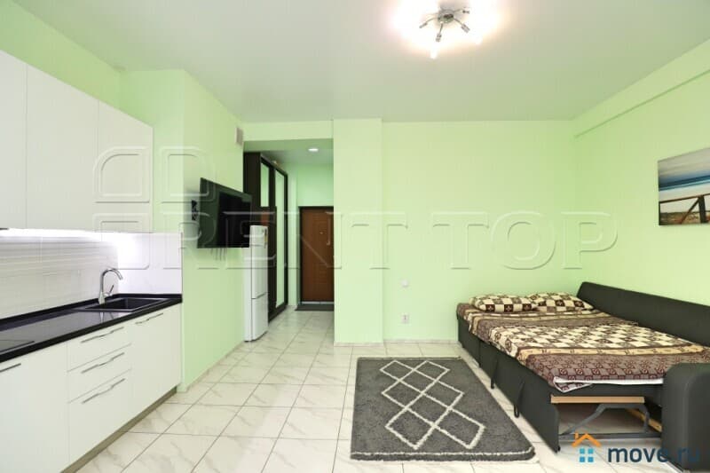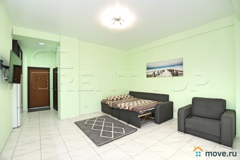 Студия рассчитана на размещение до 3 гостей. Планировка формата open space включает кухонную зону и жилое пространство с диваном-кроватью и раскладным креслом. Современный интерьер.