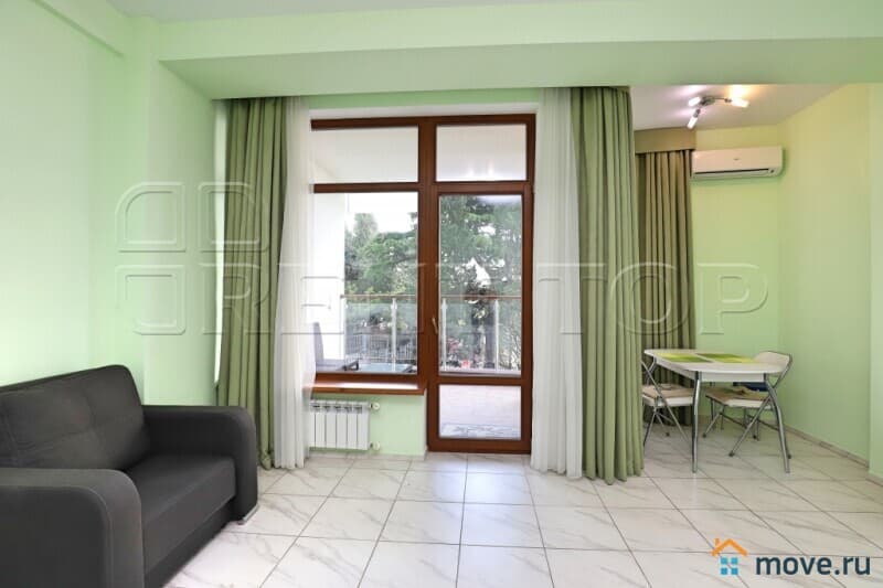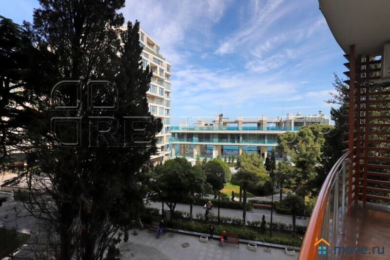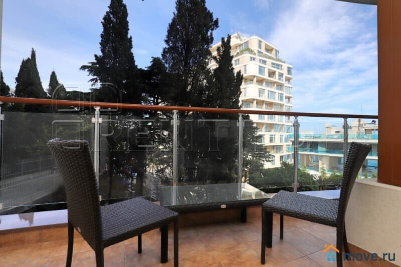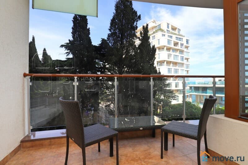 Просторный балкон оборудован летней мебелью. С балкона открывается частичный вид на море и территорию Приморского парка.